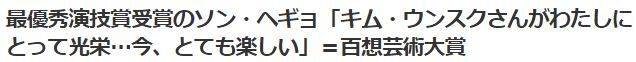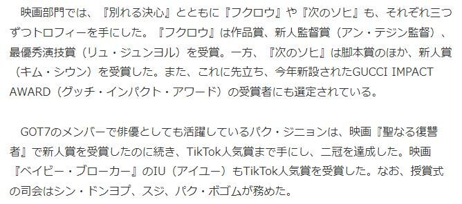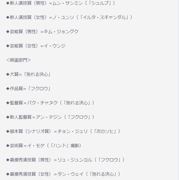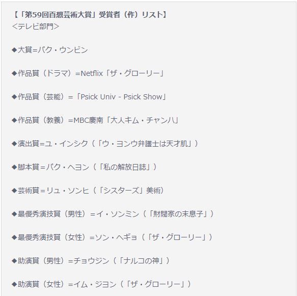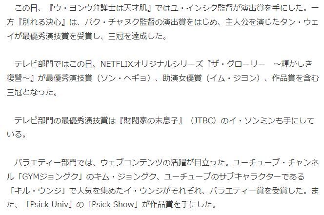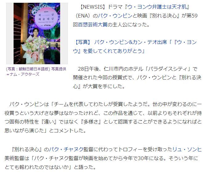 2023年04月30日 韓国 百想芸術大賞はパク・ウンビン~~ !(^^)! カテゴリ:韓流 今年はパク・ウンビンが大賞を受賞~~~おめでとうございます!!!ドラマ「ウ・ヨンウ弁護士は天才肌」が大ヒット~納得の受賞ですね~そして同じドラマでも ジャンルが違う「グローリー」がヒット中のソン・ヘギョが最優秀演技賞~おめでとうございます!やっぱ賞レース受賞は 俳優にとって勲章ですね!(^^)!記事朝鮮日報 Kstyle様からお借りしましたにほんブログ村に参加していますにほんブログ村にほんブログ村 「韓流」カテゴリの最新記事 コメント コメントフォーム 名前 コメント 記事の評価 リセット リセット 顔 星 情報を記憶 コメントを投稿する 韓国 お久しぶりイ・ビョンホン日本ファンミ~ !(^^)!韓国 BTS J-HOPEが銃を携えた軍服姿~ (^_^.)