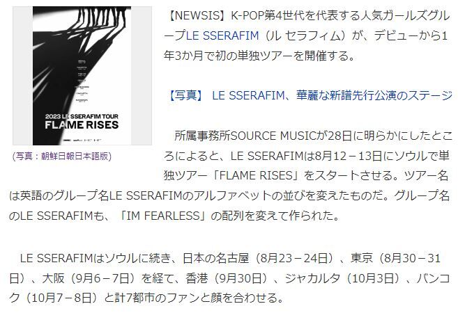 2023年06月29日 韓国 LE SSERAFIM コンサート~ (^o^) カテゴリ:韓流 「LE SSERAFIM」単独公演~初ツアーなんですね~日本全国で待っているファンは大勢いますね~プラチナチケットに なりそう~~~しかし次から次へとK-POPアーティストがやってきて懐事情が なかなか…追いつきません…っていうのが実情です(泣笑)(^o^)記事朝鮮日報様からお借りしましたにほんブログ村に参加していますにほんブログ村にほんブログ村 「韓流」カテゴリの最新記事 コメント コメントフォーム 名前 コメント 記事の評価 リセット リセット 顔 星 情報を記憶 コメントを投稿する 韓国「WOODZ」スンヨン君のコンサート行きました (^o^)韓国 元BIGBANGタプちゃん「イカゲーム2」出演!って (^o^)