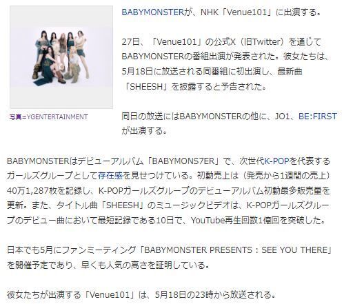 2024年04月29日 韓国 凄いラインナップ!BABYMONSTER&JO1&BE:FIRST (^o^) カテゴリ:韓流 NHK「Venue101」BABYMONSER 登場~~~ウリJO1に BE:FIRSTと豪華なラインナップ~やるな!NHK(爆)視なきゃ!(^o^)記事Kstyle様からお借りしましたにほんブログ村に参加していますにほんブログ村にほんブログ村 「韓流」カテゴリの最新記事 コメント コメントフォーム 名前 コメント 記事の評価 リセット リセット 顔 星 情報を記憶 コメントを投稿する 韓国 ウォンビン氏引退説… (-_-;)韓国 キム・スヒョン&キム・ジウォン視聴率!最高で終 (^o^)