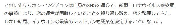 2020年08月30日 韓国 梨泰院の主ホン・ソクチョンの悲劇 (+o+) カテゴリ:韓流 にほんブログ村コロナ禍で持ちこたえられなかった~数カ月前には~コロナの影響で 客離れが始まっていたぁしかし世界的大流行韓国も 下火に見えたが…再び 感染が…梨泰院だけでなく…日本でも止む無く 店をたたむ人たちが…かつては梨泰院で何件もお店を開いていた俳優ホン・ソクチョン氏収束したらまた戻ってきてください(^o^)丿記事WoWkorea様からお借りしましたにほんブログ村に参加していますhttp://にほんブログ村http:// 「韓流」カテゴリの最新記事 コメント コメントフォーム 名前 コメント 記事の評価 リセット リセット 顔 星 情報を記憶 コメントを投稿する 韓国 女優カン・ソラ結婚式 (^_-)-☆韓国 ヨン様48歳誕生日~ (*^_^*)